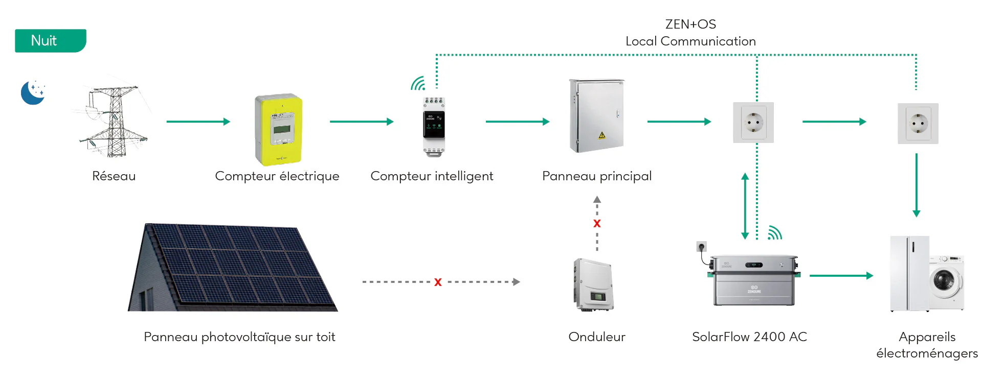 Pendant la journée, SolarFlow 2400 AC alimente votre maison en énergie solaire et stocke l’excédent dans la batterie. Le soir, la batterie fournit de l’énergie à votre maison via le SolarFlow 2400 AC. Cette gestion énergétique efficace réduit votre dépendance au réseau et vous permet de réaliser des économies.